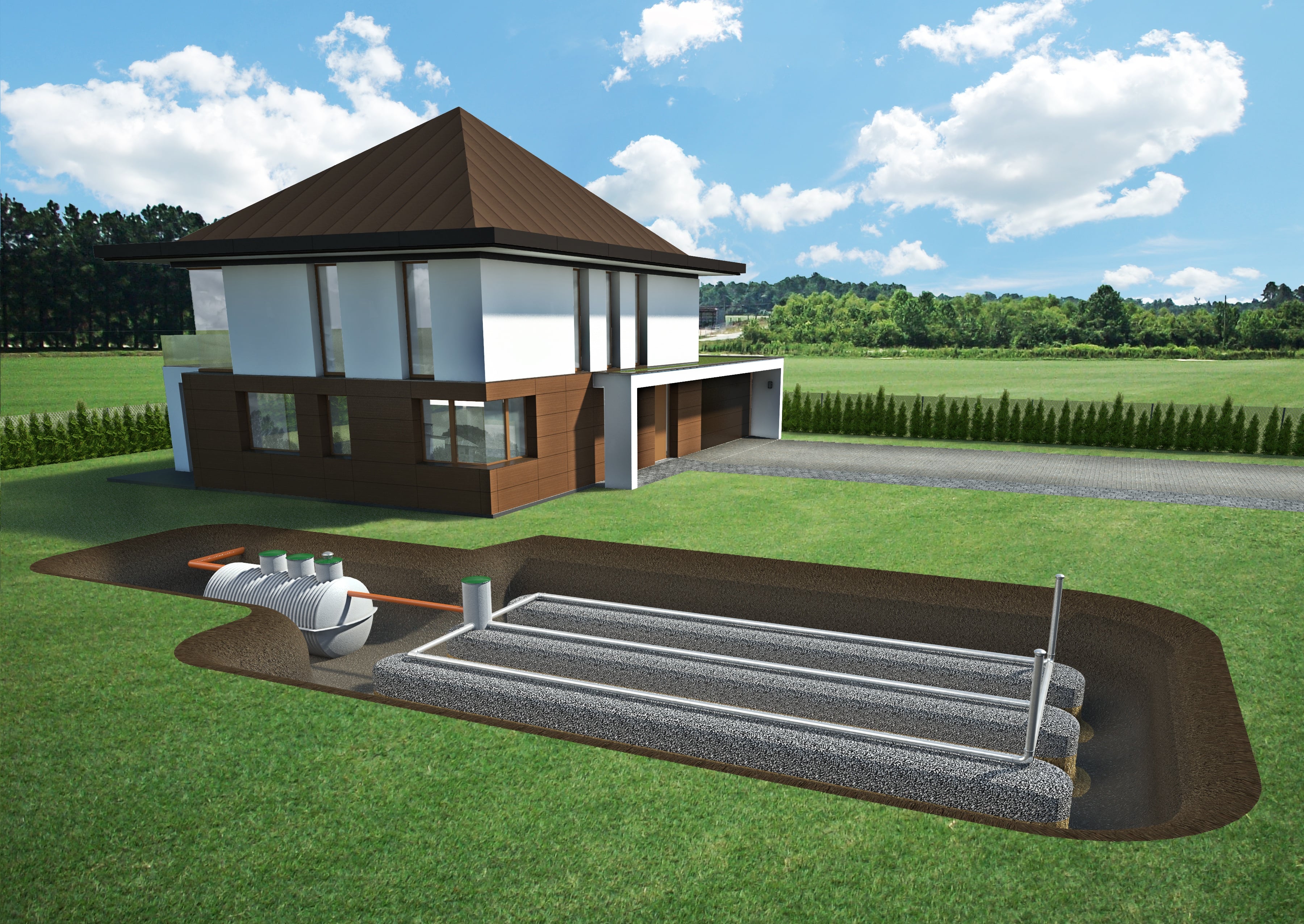 Usługa nie zawiera kosztów ew. badań geologicznych, uzgodnień kolizji sieci uzbrojenia terenu, uzyskania zgody Wód Polskich na odprowadzenie ścieków do otoczenia itp.