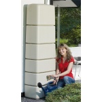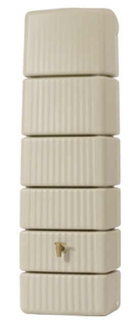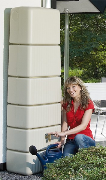 Zbiornik naścienny Slim w kolorze beżu piaskowego z łatwością zbierze do 300 litrów deszczówki z rur spustowych.