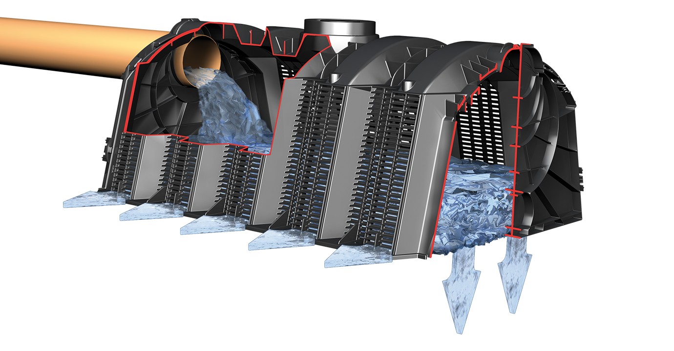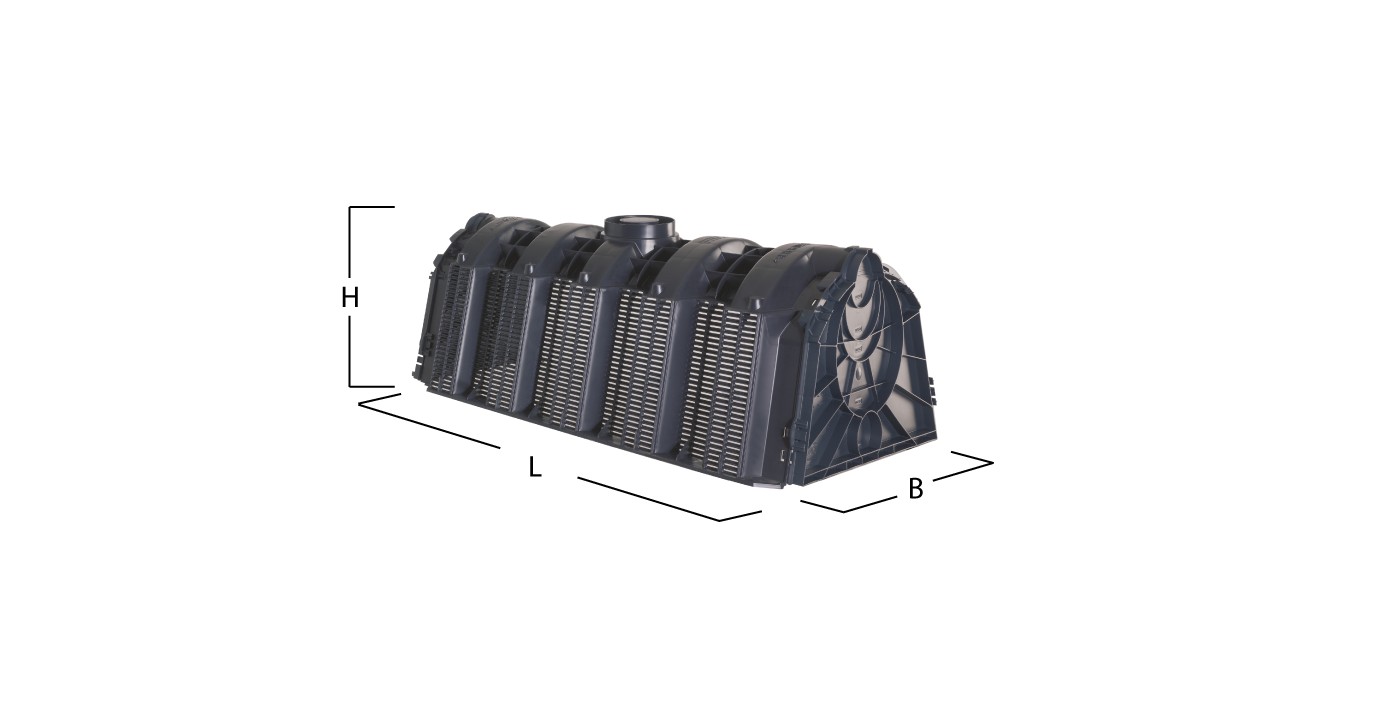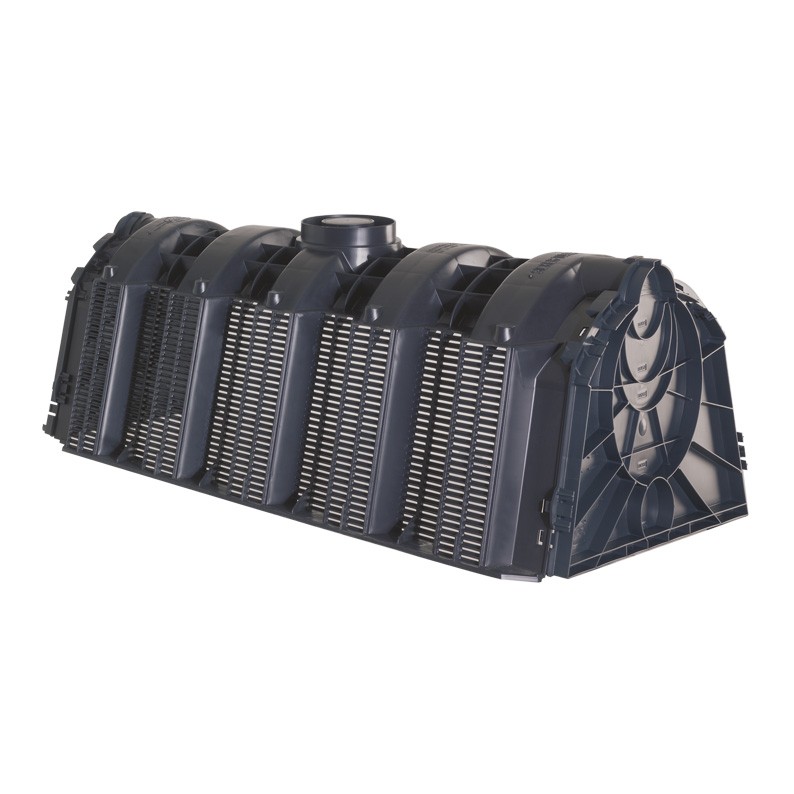 Tunel rozsączający pozwala na zatrzymywanie i rozsączanie wód opadowych. Charakteryzuje się modułową budową, dzięki czemu można łączyć ze sobą dowolną ilość sztuk – zarówno równolegle w jednej warstwie, jak i spodami.Tunel jest lekki, co ułatwia jego układanie. Jest też bardzo wytrzymały, więc powierzchnia nad tunelem nadaje się do dowolnego wykorzystania, w tym przeznaczenia na ruch samochodowy.Zestaw tuneli o pojemności 1800 l