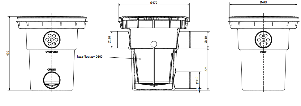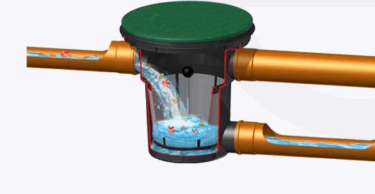 Łatwy serwis i montaż – wszystkie przyłącza Ø110 mm zostały zintegrowane z korpusem, co zapewnia szczelność i stabilność. Przykręcana pokrywa umożliwia szybki dostęp do kosza filtracyjnego, a w razie potrzeby filtr można posadowić głębiej, stosując nadbudowy D400 H200 AQ.