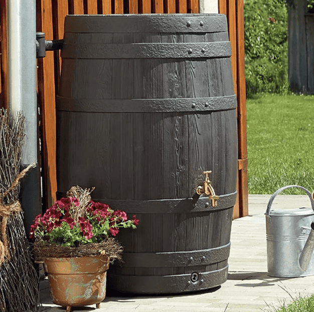 Wolnostojący zbiornik na deszczówkę Vino o pojemności 250 litrów wygląda, jak stara beczka na wino w kolorze ciemnego drewna.