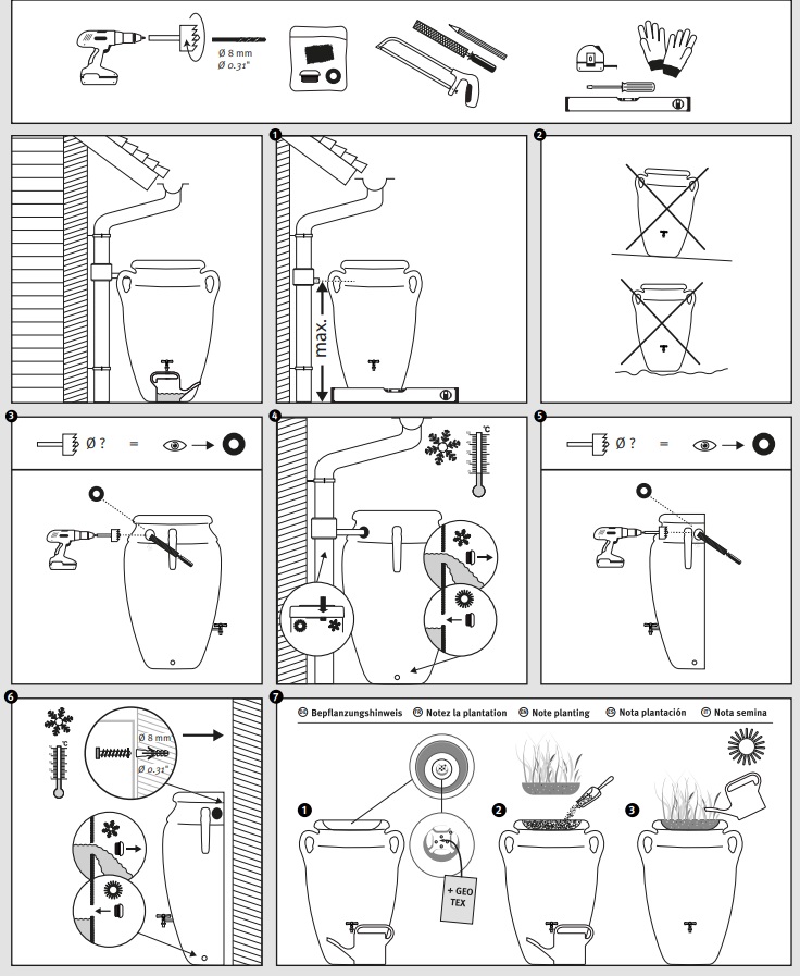 Z przodu zbiornika znajduje się gwintowany otwór ¾” na kranik oraz otwór Ø50 mm z uszczelką do podłączenia rury od zbieracza. Górna część może służyć jako donica na rośliny ozdobne. Zbiornik posiada dwa wysokiej jakości gwinty, co umożliwia montaż bez wiercenia. W zestawie znajduje się uszczelka DN 19/32 oraz włóknina filtrująca.