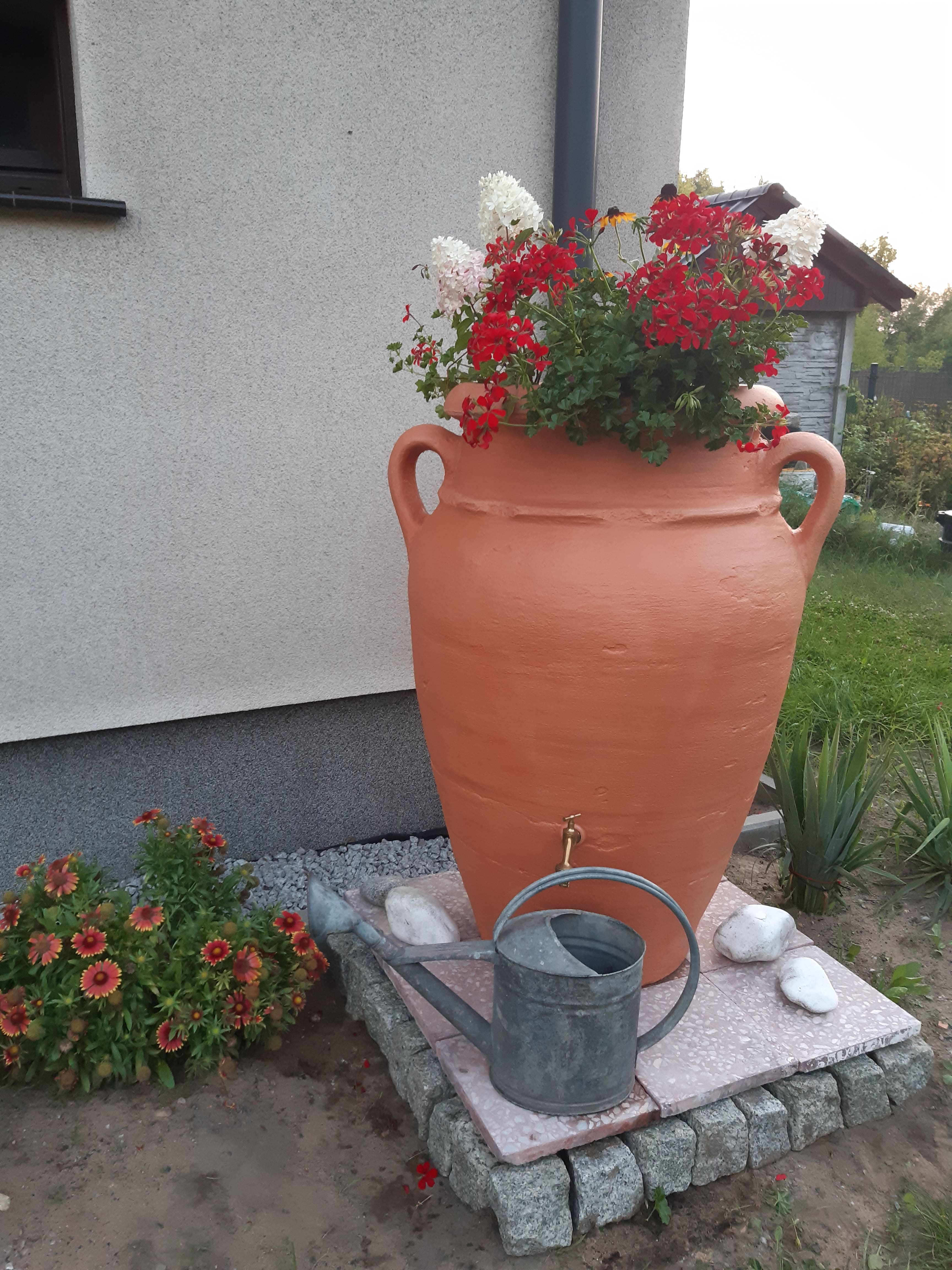 Co więcej – górna część zbiornika może pełnić funkcję donicy, w której zasadzisz ulubione kwiaty lub rośliny pnące. Gdy zbiornik wypełni się wodą, a jego wierzch rozkwitnie kolorami, staje się prawdziwą ozdobą każdego tarasu, patio czy przydomowego ogrodu.