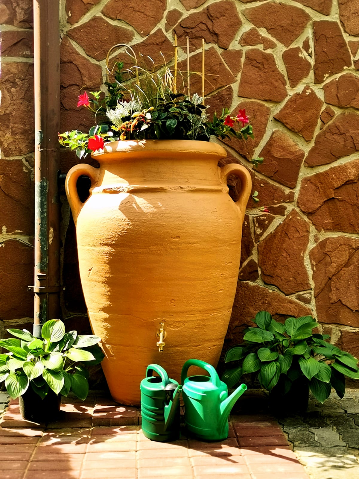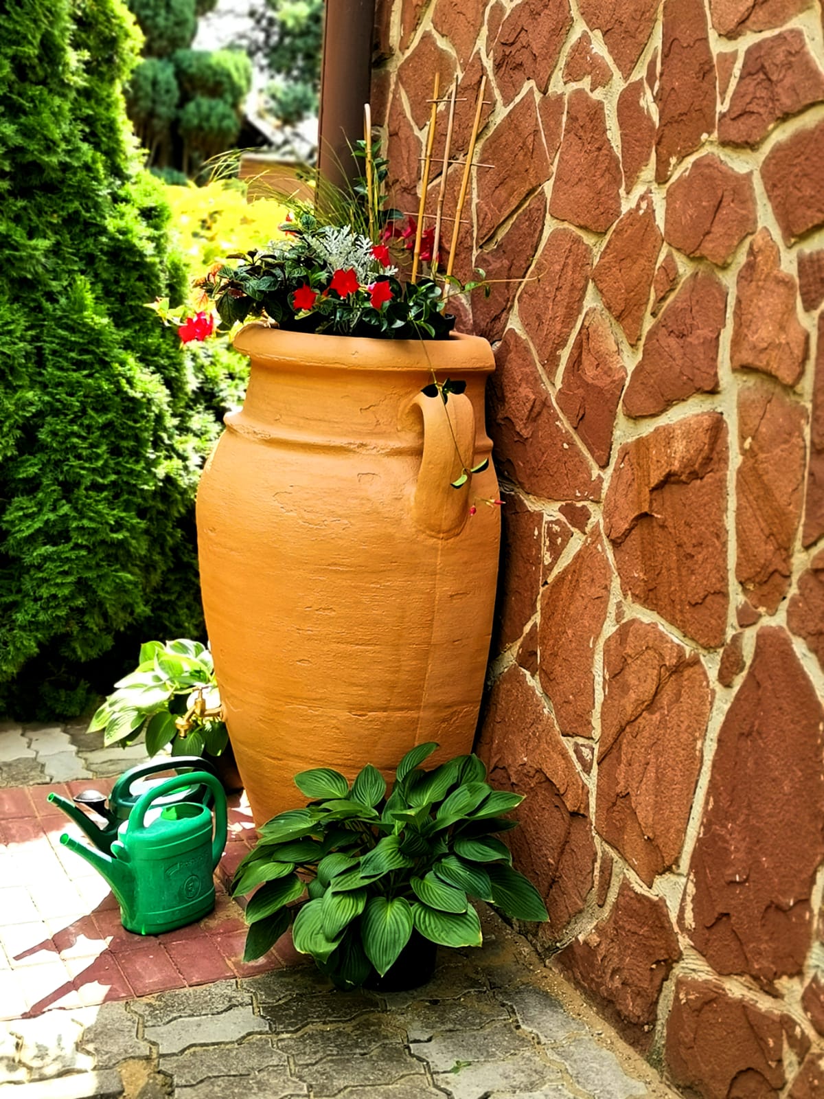 Zbiornik dekoracyjny w formie antycznej amfory to nie tylko praktyczne rozwiązanie do zbierania wody deszczowej, ale także elegancka ozdoba ogrodu. Inspirowany greckim stylem, swoim kształtem i wykończeniem przypomina autentyczne naczynie z terakoty, dzięki czemu doskonale komponuje się z naturalnym otoczeniem.