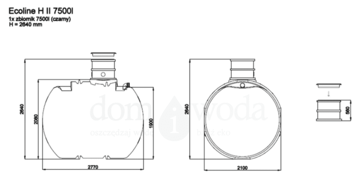 Nadbudowa H = 560 mm, dzięki czemu ułatwia dopasowanie poziomu włazu do rzędnej terenu przy montażu zbiornika podziemnego. W razie potrzeby można domówić teleskop wznoszący, który pozwala dodatkowo wydłużyć właz i precyzyjnie ustawić jego wysokość. Przy włazie zastosowano uszczelkę DN 600, która poprawia szczelność.