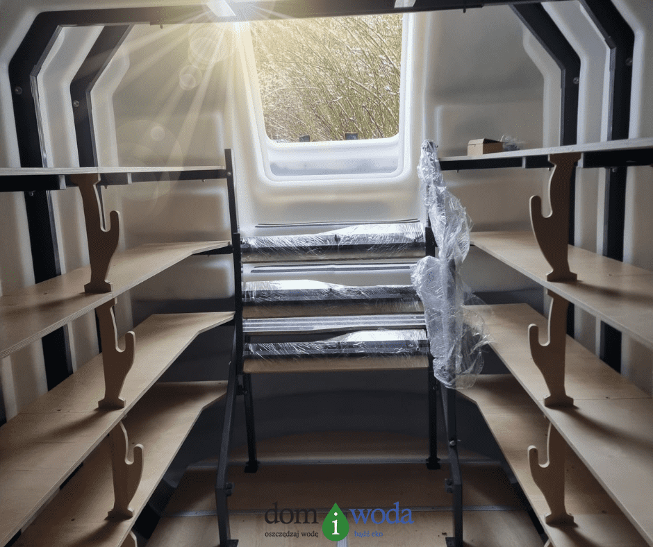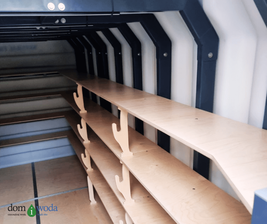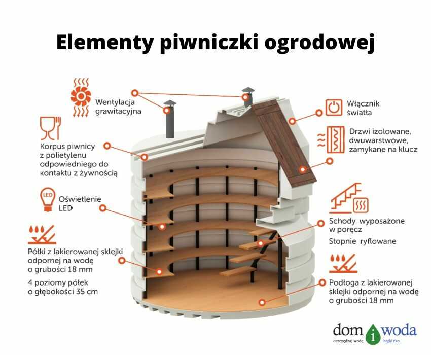 Wykonana z trwałego polietylenu o grubości ścianki 12–15 mm, ziemianka nie chłonie wody, a jej gładkie ściany gwarantują łatwość utrzymania czystości. Wewnątrz wzmocniona została stalową ramą, do której przymocowano solidne półki – idealne na zapasy i słoiki. Przemyślany system wentylacji grawitacyjnej zapewnia naturalny przepływ powietrza i chroni przed wilgocią oraz pleśnią, zachowując świeżość produktów na dłużej.