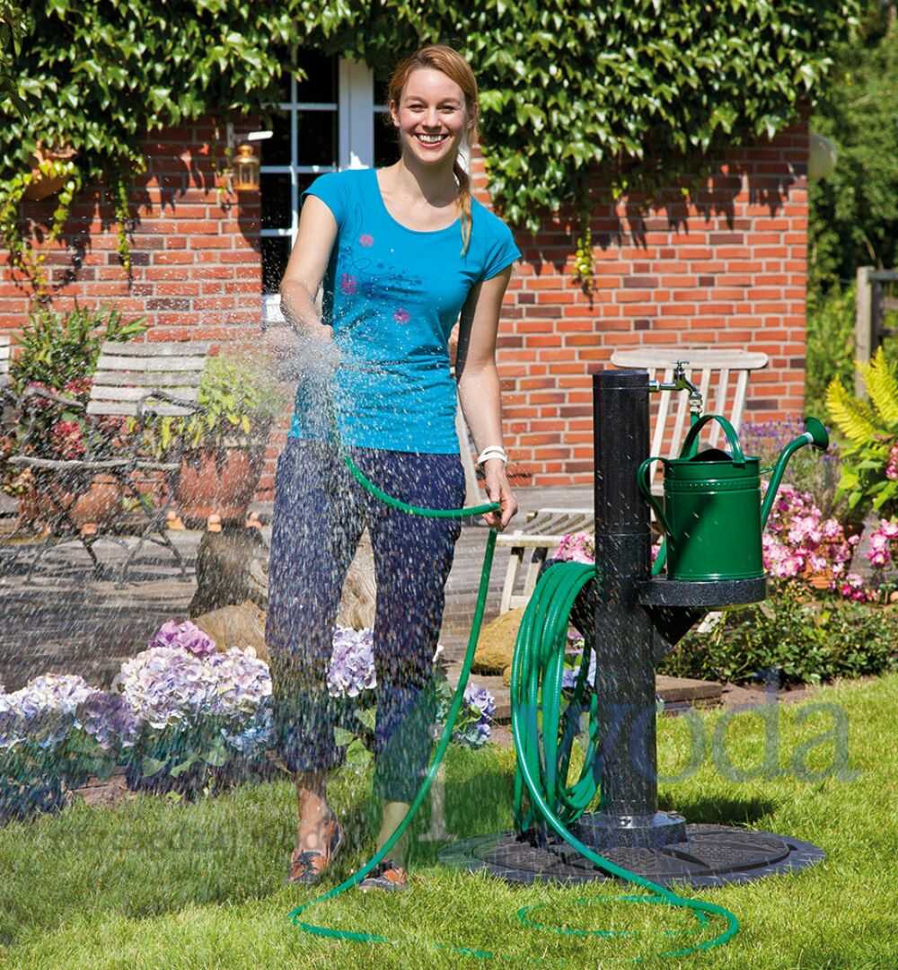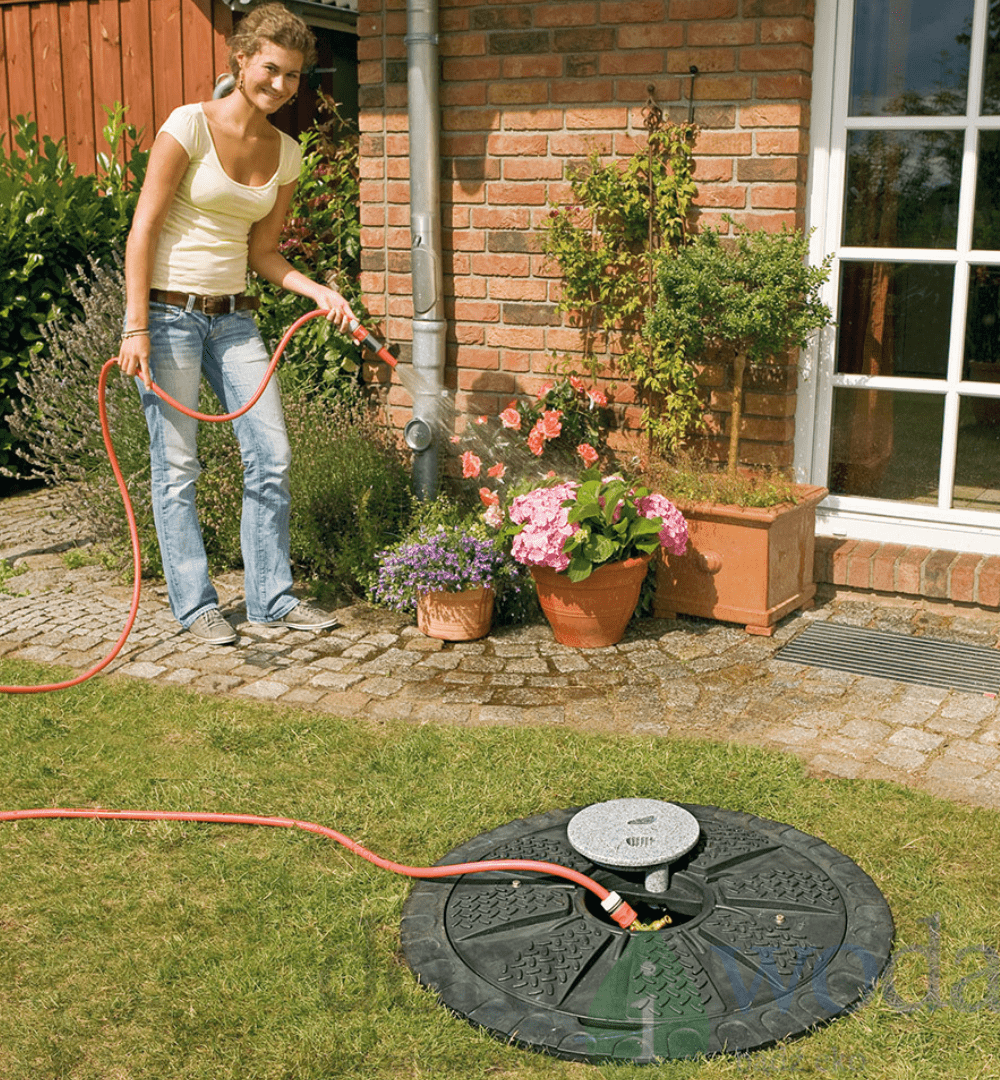 Umożliwia pobór wody ze zbiornika, poprzez wpięcie węża ogrodowego do trójnika z zaworami, który jest w pokrywie, to bardzo proste i estetyczne rozwiazanie.