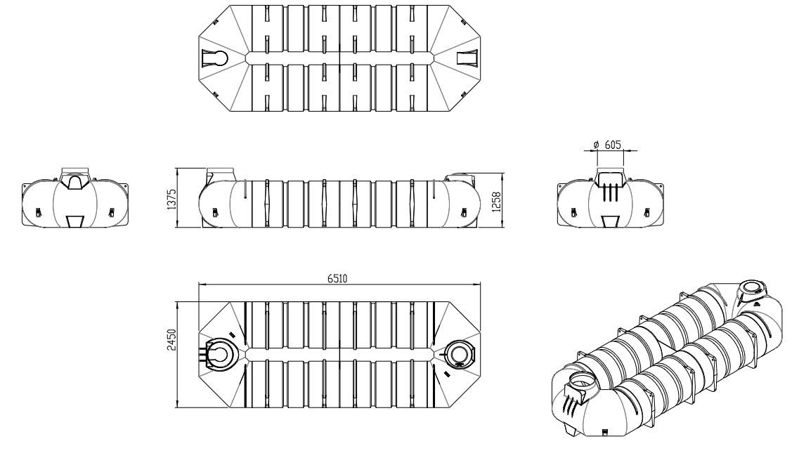 Są 3 przyłącza ø110 mm oraz otwór rewizyjny DN600 w każdym zbiorniku.