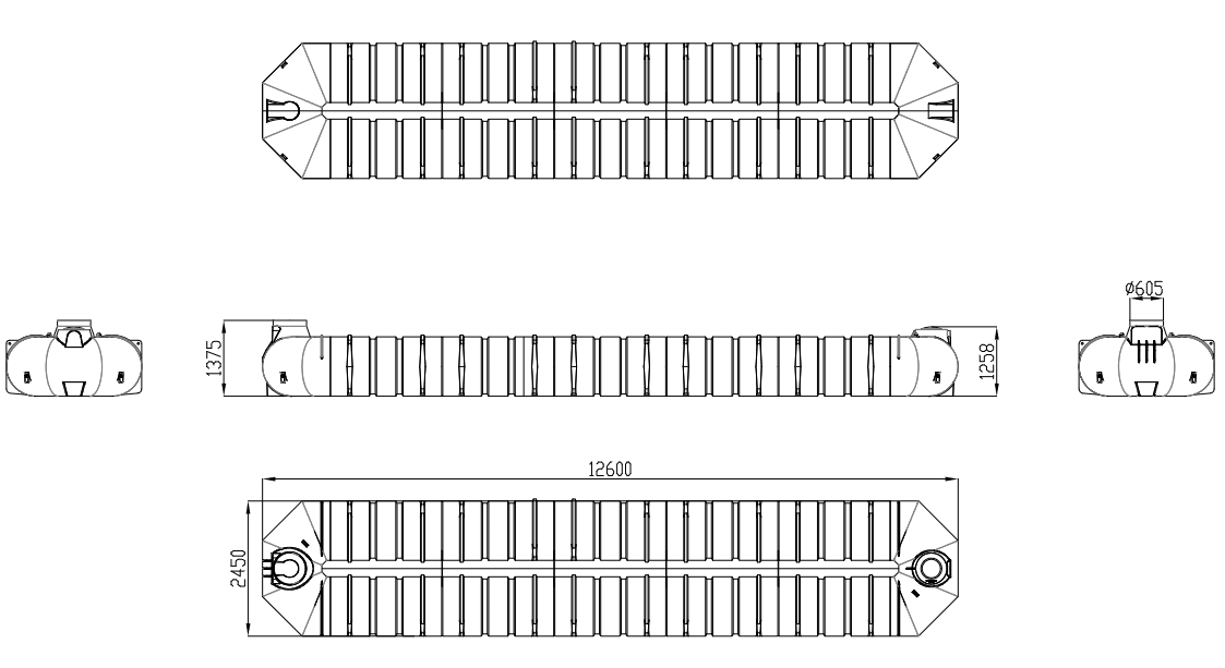 Są 3 przyłącza ø110 mm oraz otwór rewizyjny DN600 w każdym zbiorniku.
