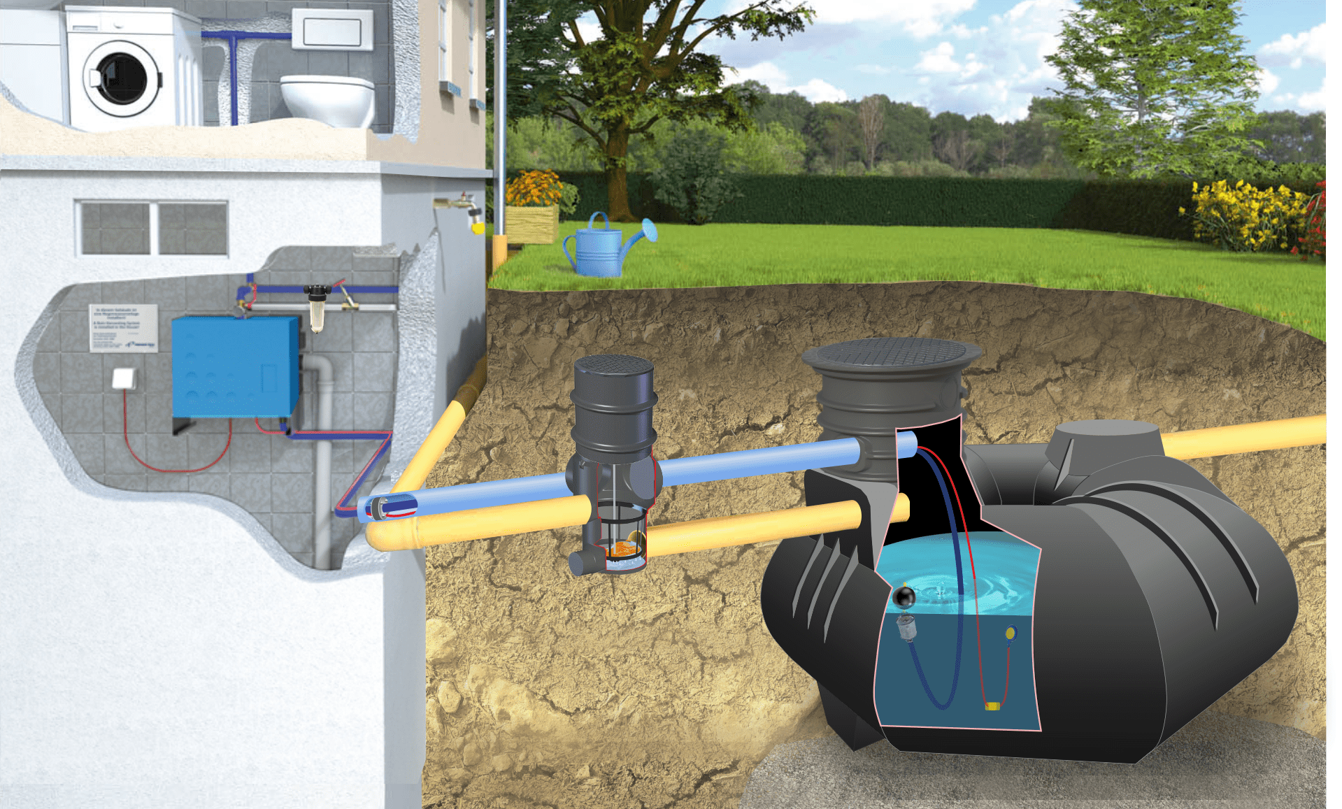 System zagospodarowania wody deszczowej może funkcjonować poprawnie również przy pustym zbiorniku magazynującym, ponieważ w takiej sytuacji przez urządzenie do odbiornika doprowadzana jest woda wodociągowa. Do centrali należy doprowadzić podłączenie wody wodociągowej. W przypadku braku deszczówki w zbiorniku centrala automatycznie przełączy się na tryb pracy z wodą z sieci. Urządzenie spełnia wymagania normy PN-EN 1717 dotyczące swobodnej przerwy powietrznej. Rura ssąca jest zakończona pływającym poborem wody.