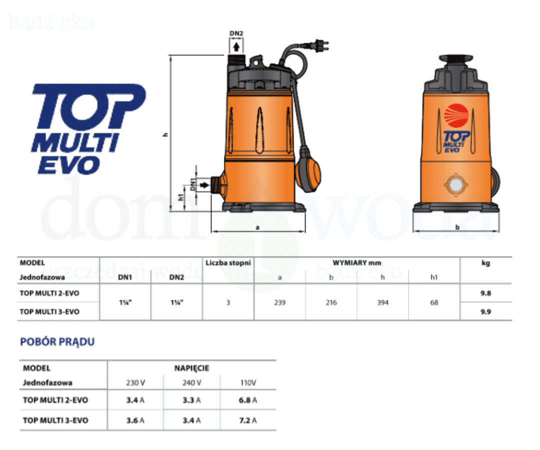 Pompa Top Multi- Evo jest ciśnieniową pompą zatapialną, która jest zbudowana z wysokiej jakości technopolimerów, wzmacnianych włóknem szklanym, dzięki temu ma doskonałą odporność.