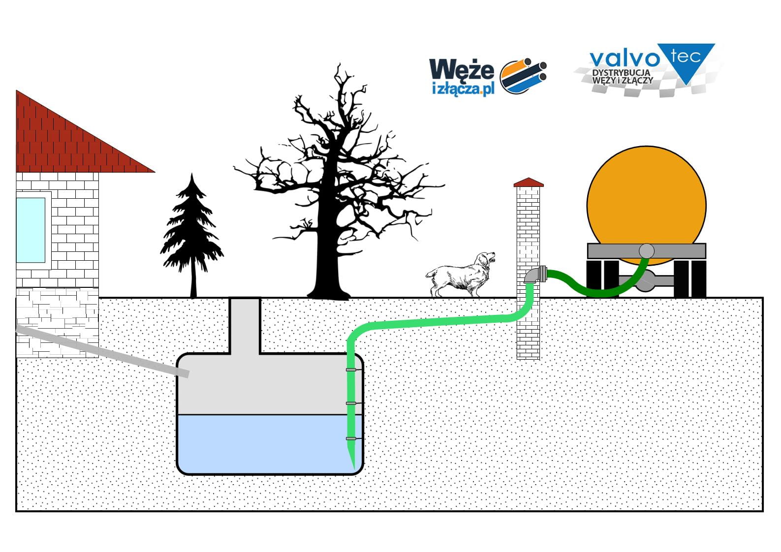 Odcinek węża zanurzony w szambie należy ściąć skośnie i umocować do ściany, w taki sposób by uniemożliwić "przyssanie" się końcówki do dna lub ścianki zbiornika.