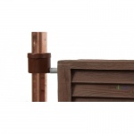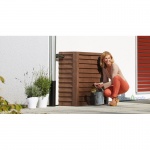 Zbiornik WOODY jest odporny na działanie promieni UV oraz zmienne warunki atmosferyczne, co gwarantuje jego trwałość przez lata. Wbudowane dwa mosiężne gwinty pozwalają na szybkie i wygodne podłączenie kranika lub węża – bez potrzeby używania wiertarki. Dodatkowo pojemnik jest szczelny i stabilny.