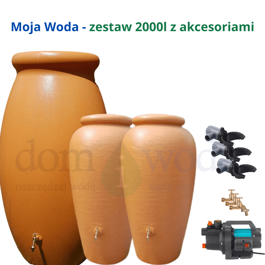 Ozdobny zbiornik wyglądający jak gliniana amfora ma pojemność 500 litrów, więc znakomicie pomieści duże ilości wody deszczowej.
