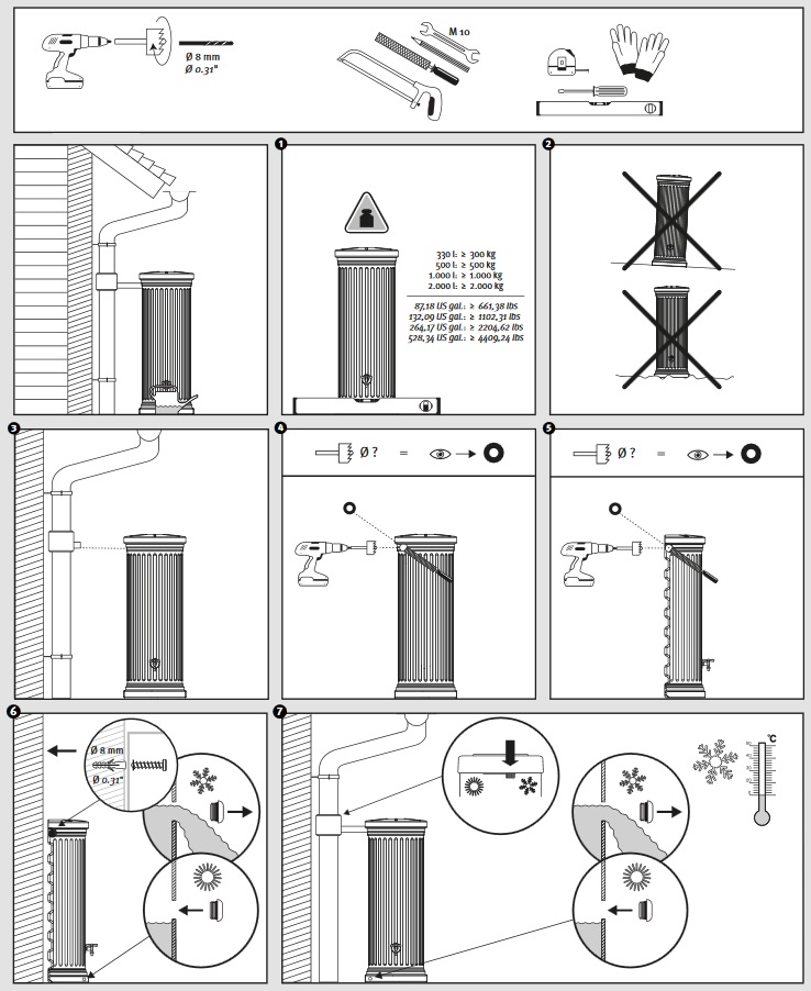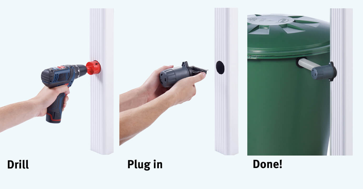 W komplecie znajduje się zbieracz wody deszczowej Rapido oraz wyrzynarka – wystarczy wywiercić otwór w rurze spustowej i zamontować zbieracz. Cały proces jest szybki i intuicyjny – zobacz instrukcję na filmie poniżej.