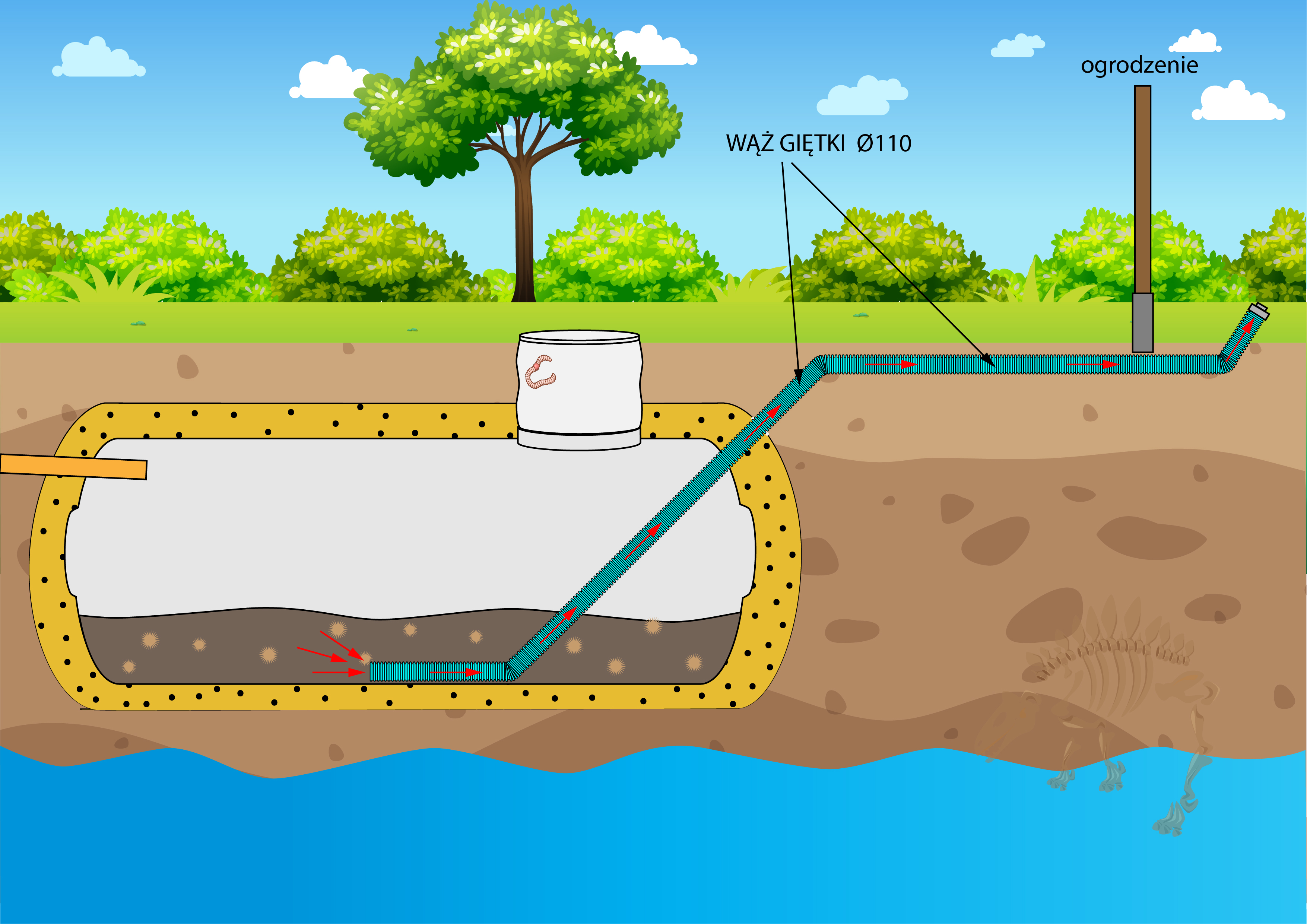 Odcinek węża zanurzony w szambie należy ściąć skośnie i umocować do ściany, w taki sposób by uniemożliwić "przyssanie" się końcówki do dna lub ścianki zbiornika.