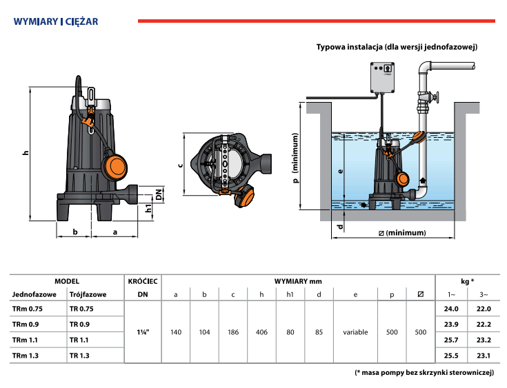 85 mm dla modeli TR 0.75, TR 0.9, TR 1.1, TR 1.3