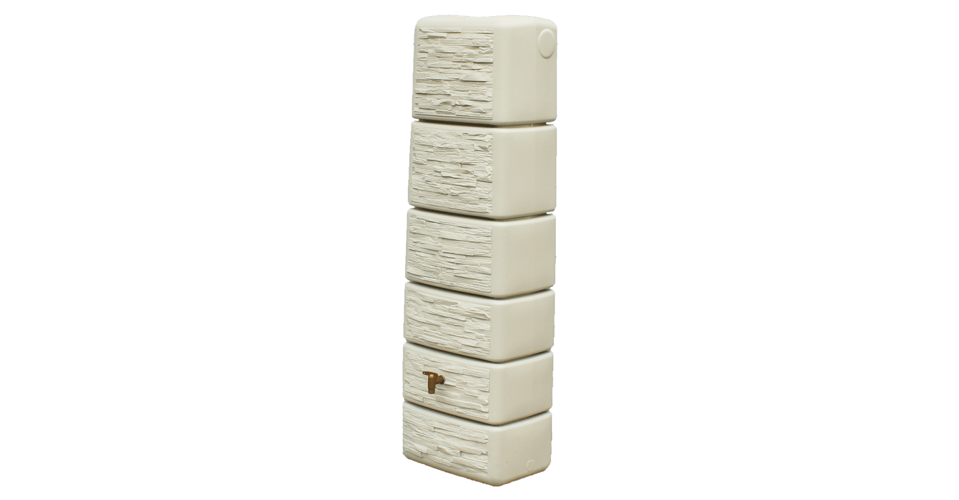 Zbiornik naścienny Slim w kolorze beżu piaskowego z łatwością zbierze do 300 litrów deszczówki z rur spustowych.