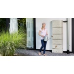 Zbiornik naścienny Slim w kolorze beżu piaskowego z łatwością zbierze do 300 litrów deszczówki z rur spustowych.
