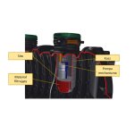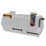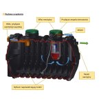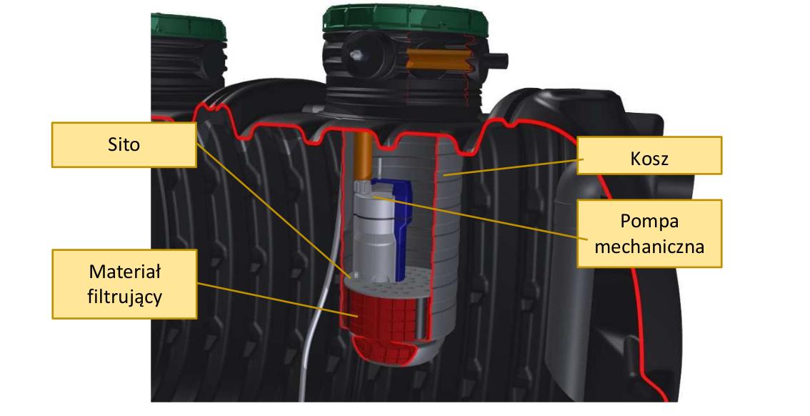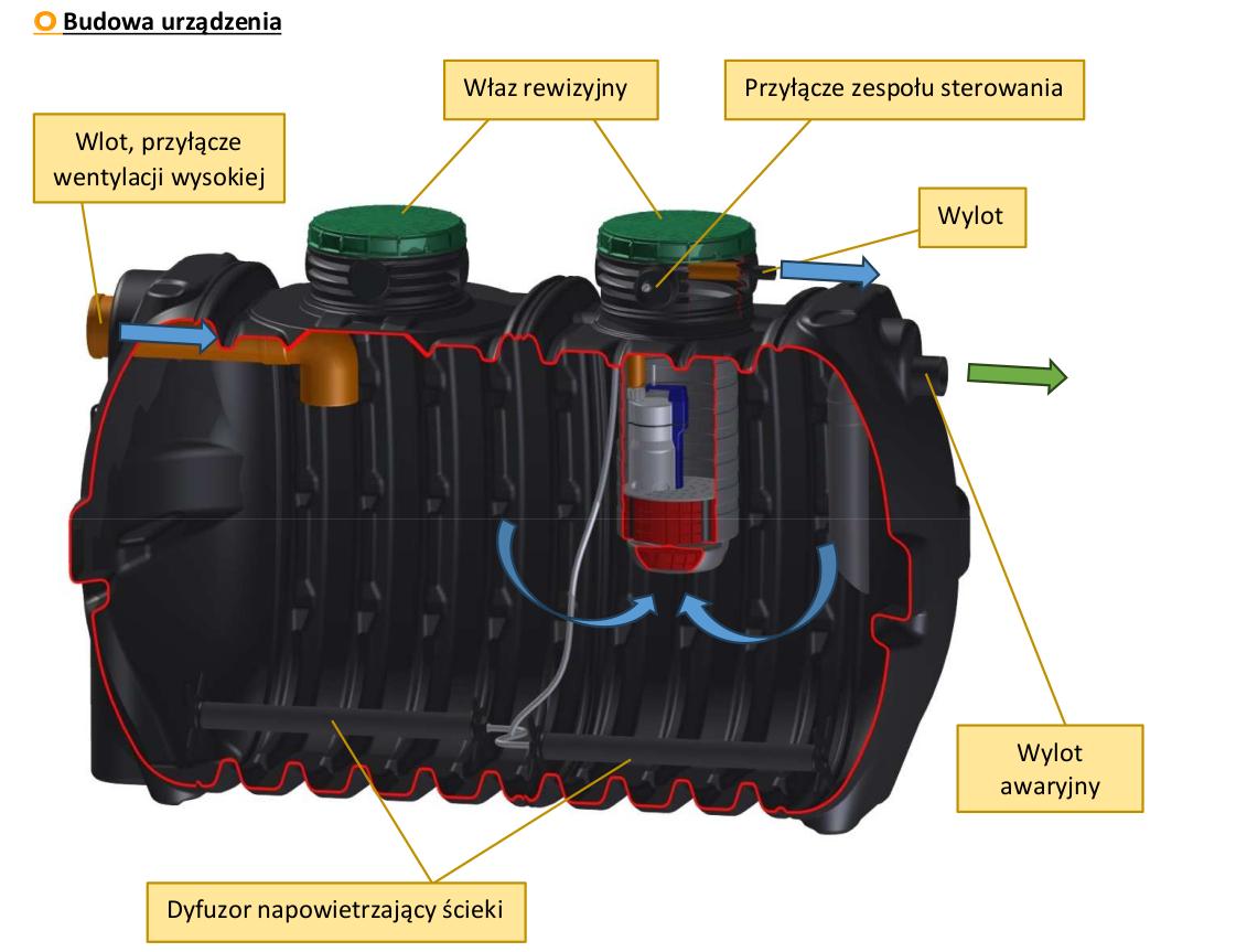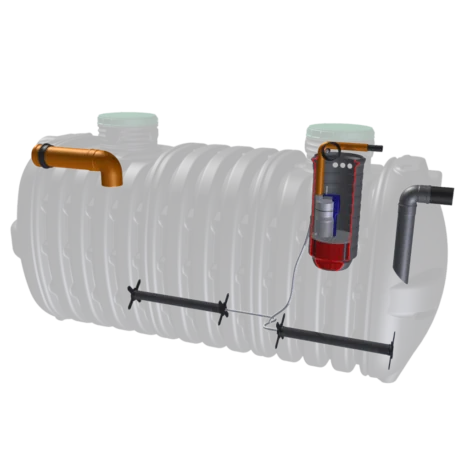 Pompa mechaniczna: Wewnątrz oczyszczalni znajduje się pompa mechaniczna w specjalnym koszu, która umożliwia ciśnieniowe odpompowanie oczyszczonego ścieku. Pracą pompy zarządza sterownik.