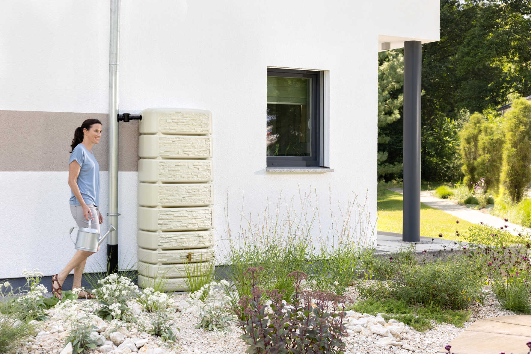 Zbiorniki na deszczówkę retencjonują wodę, co oznacza, że zebrany opad wykorzystujemy w naszych ogrodach, wokół domu, co jest zdrowsze, tańsze i eko, bo oszczędzamy wodę pitną.