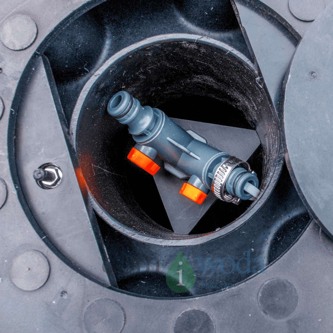 Ruchomy dwójnik z mosiądzu wewnątrz pokrywy umożliwia łatwe podłączenie węża ogrodowego do pompy – wystarczy otworzyć małą klapkę, podłączyć szybkozłączkę i rozpocząć podlewanie. Wyjście w kierunku pompy jest na wąż ciśnieniowy 19mm/(3/4'), zakończone jest króćcem choinkowym do montażu z opaską metalową.