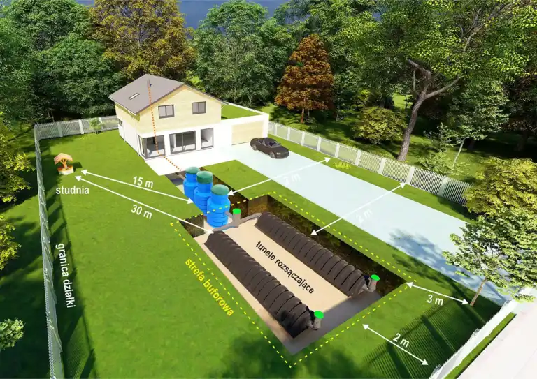 PureFlow współpracuje zarówno z klasycznym drenażem rozsączającym, jak i ze studnią chłonną czy rabatą biohydrofitową. Nawet w trudnych warunkach gruntowych oczyszczalnia utrzymuje pełną wydajność, a wentylacja wysoka poprowadzona ponad dach sprawia, że w ogrodzie nie czuć żadnych zapachów.