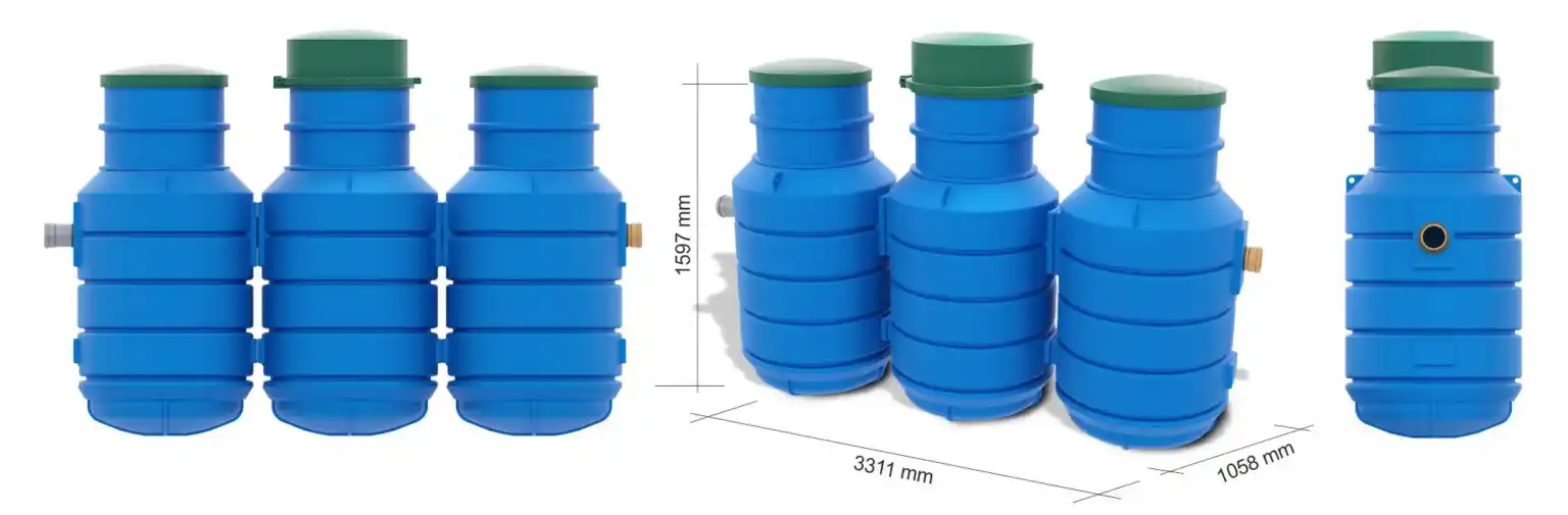 Zbiornik: czterokomorowy, monolityczny PE z wewnętrznym wzmocnieniem stalowym; pionowe użebrowanie