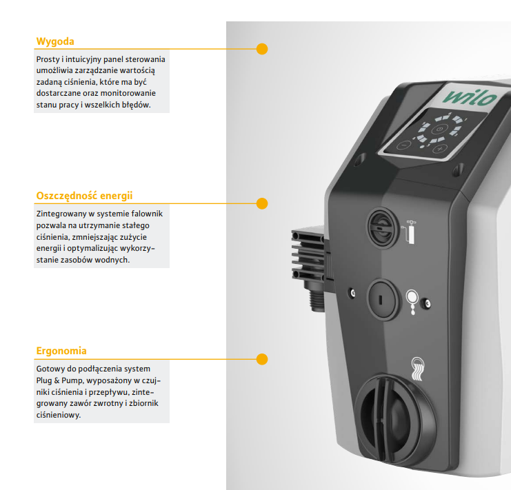 Wbudowana przetwornica częstotliwości umożliwia precyzyjną regulację ciśnienia w zależności od bieżącego zapotrzebowania, co przekłada się na komfort użytkowania i oszczędność energii. Urządzenie posiada rozbudowane funkcje ochronne (m.in. przed suchobiegiem, przegrzaniem, wahaniami napięcia), które gwarantują długą i bezpieczną eksploatację.