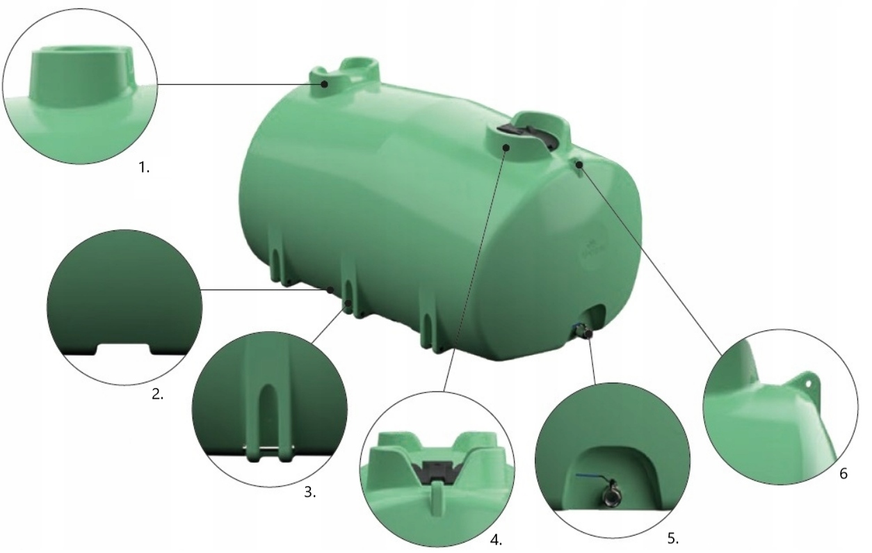 Materiał: jednopłaszczowy PE (polietylen) stabilizowany UV; konstrukcja o podwyższonej sztywności z niską martwą strefą ograniczającą zaleganie cieczy.