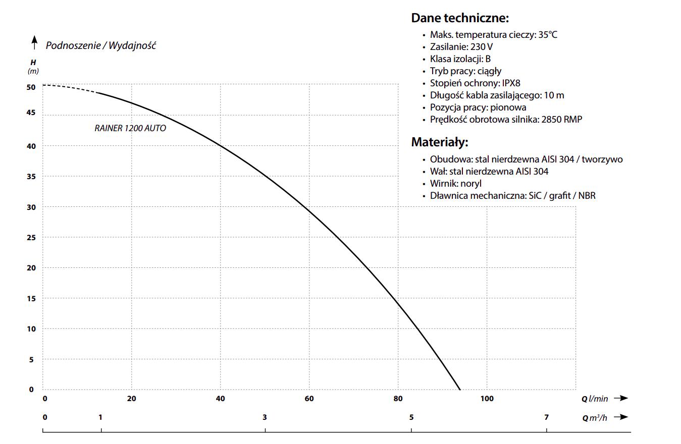 Obudowa wykonana jest ze stali nierdzewnej AISI 304, wirnik z norylu, a dławnica mechaniczna z materiałów SiC/grafit/NBR, co gwarantuje niezawodność i odporność na długotrwałe użytkowanie. Dzięki wężowemu króćcowi 1 1/1 cala oraz wydajności do 95 l/min pompa sprawdza się w instalacjach domowych i ogrodowych, oferując podnoszenie do 50 metrów słupa wody.