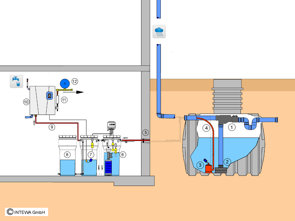2. Magazynowanie: Gromadzenie wody w podziemnym zbiorniku wyposażonym w pływający pobór.
