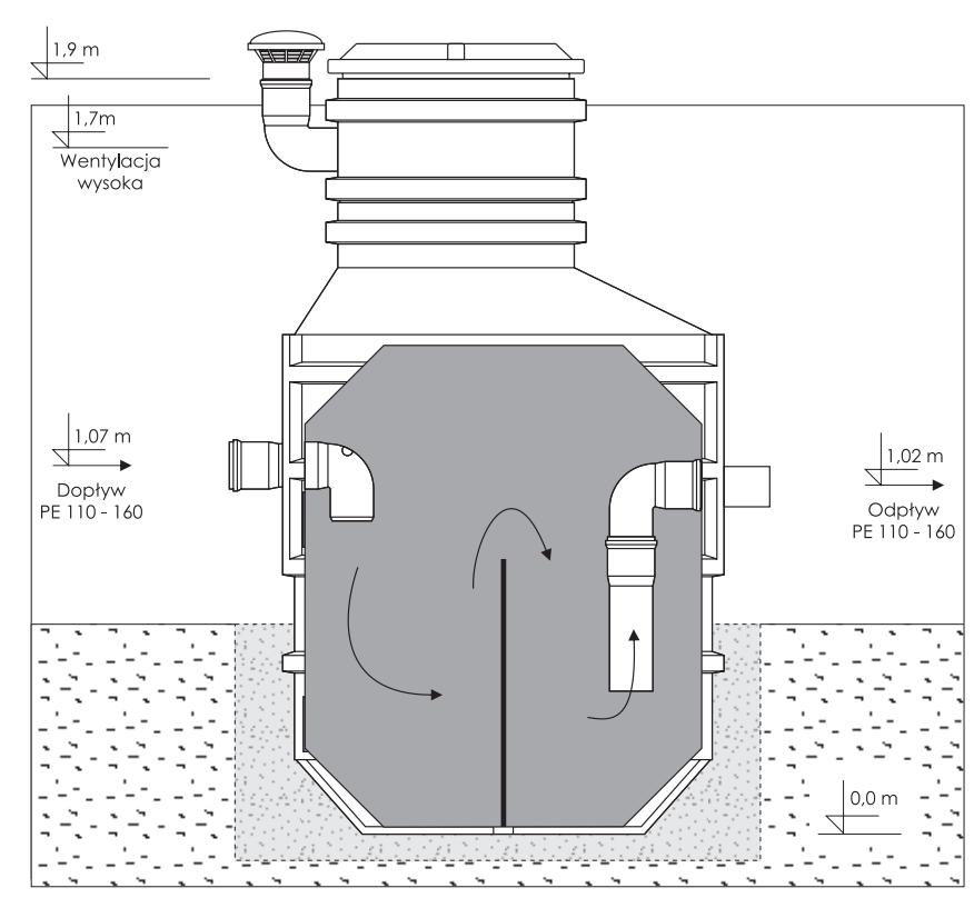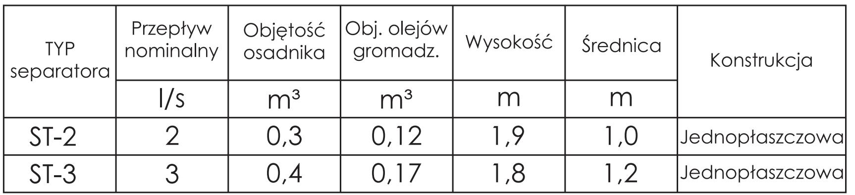 Separator ST-2 działa w oparciu o zjawisko flotacji, czyli wypychania lżejszych frakcji tłuszczu ku powierzchni oraz sedymentacji, w której cięższe zanieczyszczenia opadają na dno osadnika. Konstrukcja jednopłaszczowa i pionowa budowa ułatwiają montaż w trudniejszych warunkach terenowych, a także zapewniają stabilność eksploatacyjną. Separator osiąga przepływ nominalny 2 l/s, pojemność osadnika 0,3 m3 oraz objętość gromadzenia olejów 0,12 m3. Całość pracuje zgodnie z normą PN-EN 1825-1:2007 i posiada atest higieniczny potwierdzający bezpieczeństwo użytkowania.