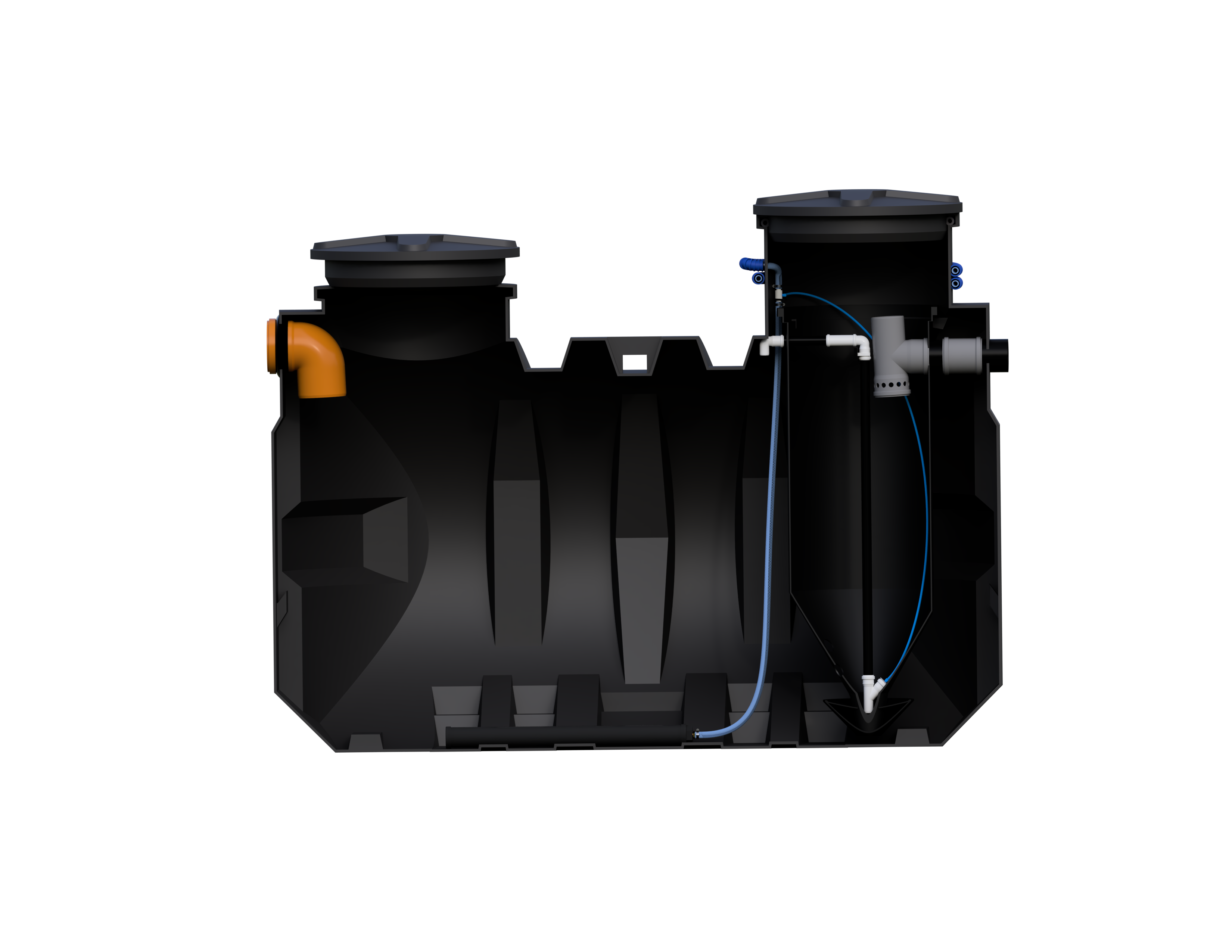 Wytrzymałość: Zbiornik wykonany jest z wytrzymałego materiału odpornego na uszkodzenia mechaniczne i wpływ środowiska, w tym wilgoci, co zapewnia długotrwałe użytkowanie. Monolityczna, żebrowana konstrukcja zapewnia najwyższe parametry szczelności zbiornika, a także ułatwia jego montaż.