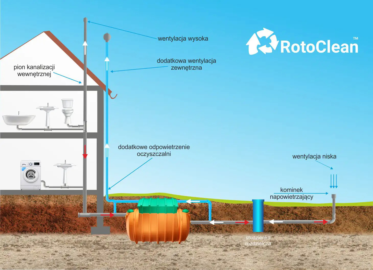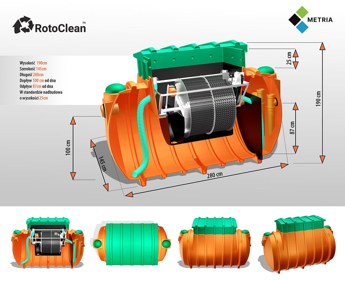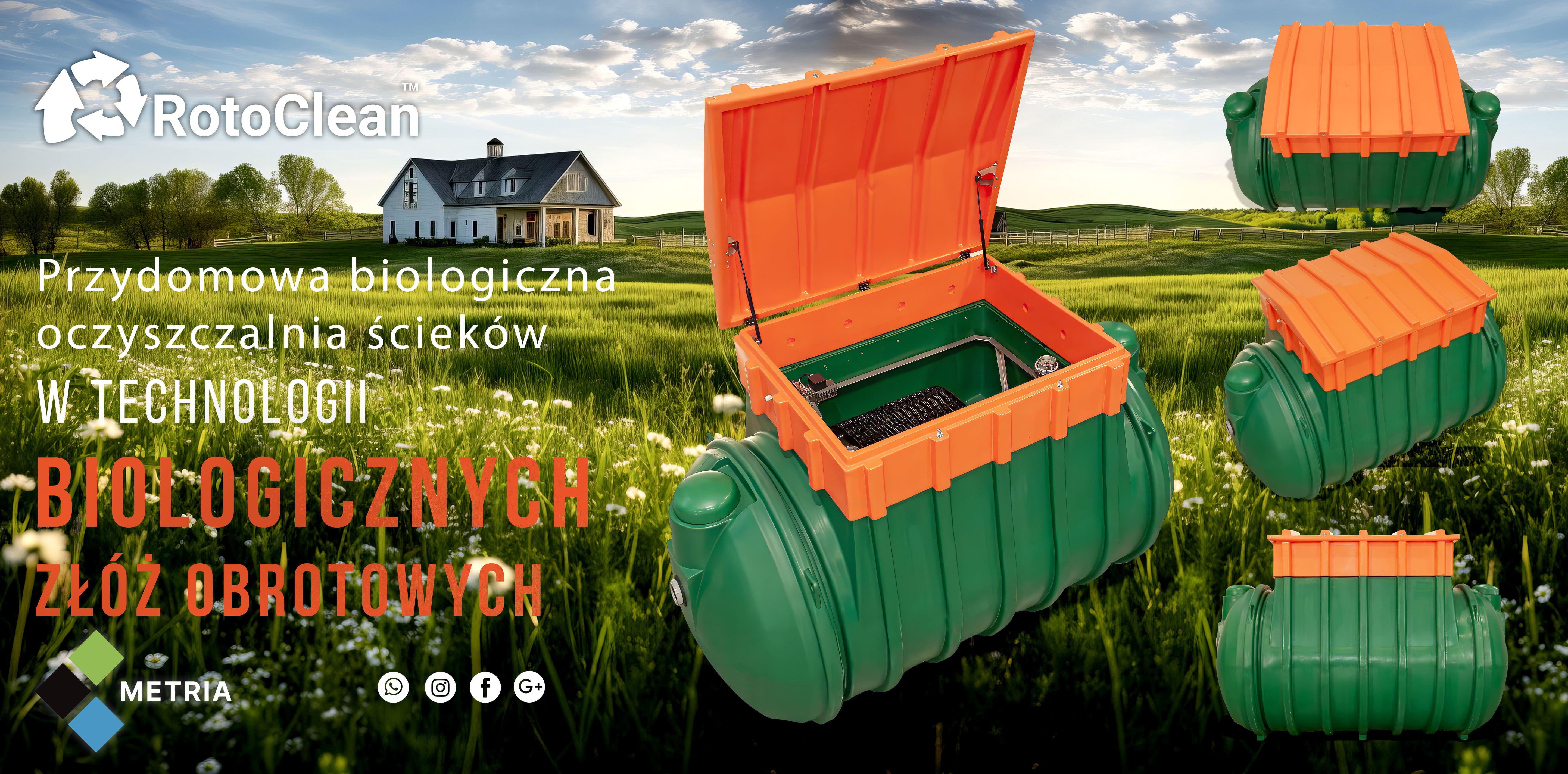 Przydomowa oczyszczalnia ścieków RotoClean Metria to najlepsze rozwiązanie dla mieszkańców małych miejscowości w całej Polsce którzy nie mają dostępu do kanalizacji sanitarnej Przydomowa oczyszczalnia ścieków biologiczna RotoClean 6 gwarantuje najwyższą skuteczność oczyszczania ścieków z gospodarstw domowych dla 1 do 6 RLM i idealnie sprawdza się w trudnych warunkach gruntowo wodnych typowych dla małych miejscowości w całej Polsce Oczyszczalnia przydomowa ze złożem obrotowym RotoClean wyróżnia się na tle konkurencji prostotą niezawodnością i minimalnymi kosztami eksploatacji co czyni ją numerem jeden wśród biologicznych oczyszczalni ścieków Metria w Polsce