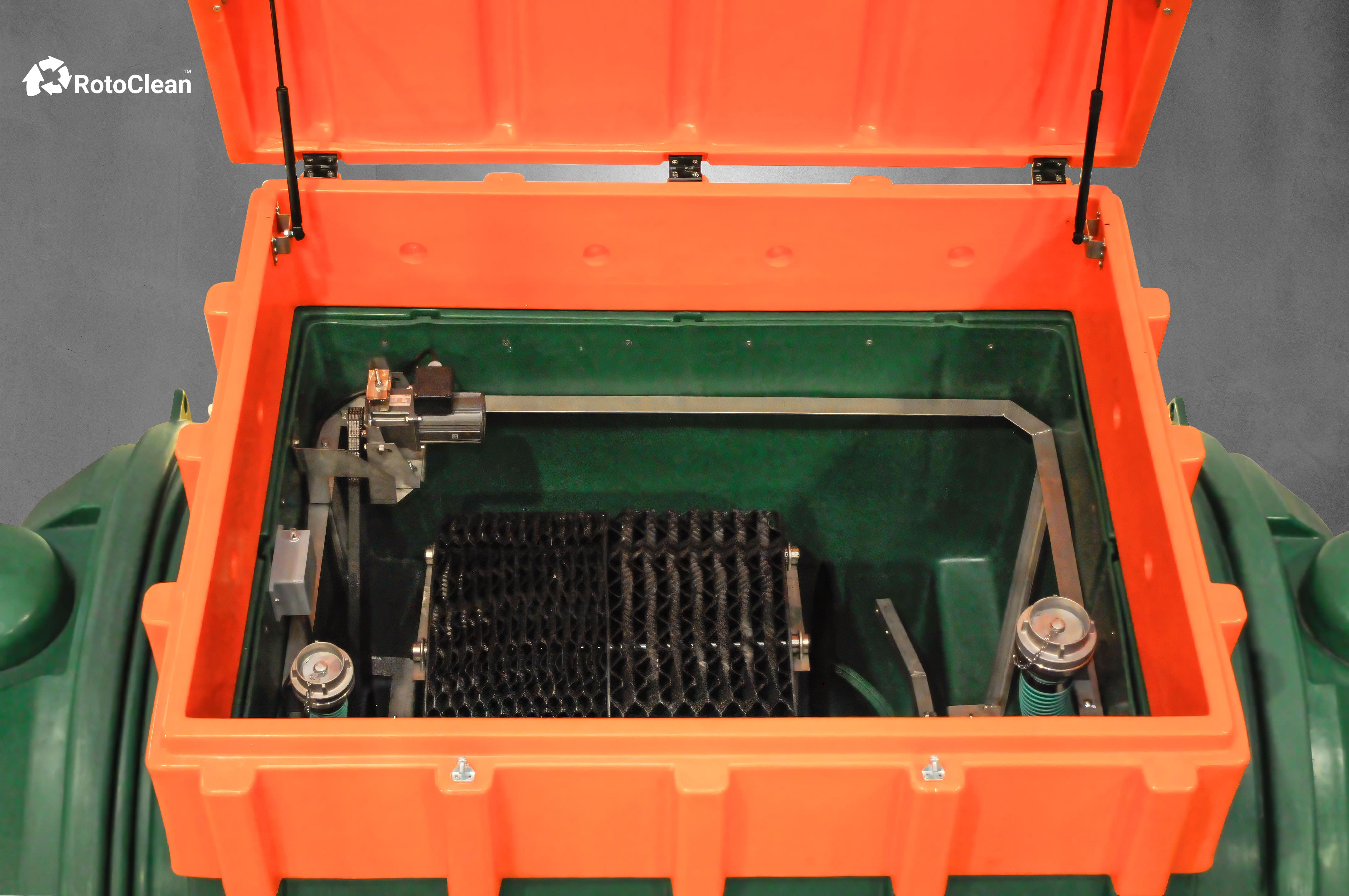 Oczyszczalnia ze złożem obrotowym RotoClean 6 wyróżnia się ekstremalnie prostą budową tylko jeden element elektryczny czyli motoreduktor dzięki czemu rachunki za prąd są minimalne a ryzyko awarii praktycznie zerowe Osadniki wstępny i wtórny wystarczy opróżniać zaledwie 1 do 2 razy w roku za pomocą wygodnych złączy Storz co jest szybkie tanie i łatwe szczególnie w małych miejscowościach gdzie asenizacja dojeżdża bez problemu