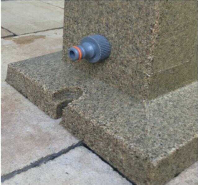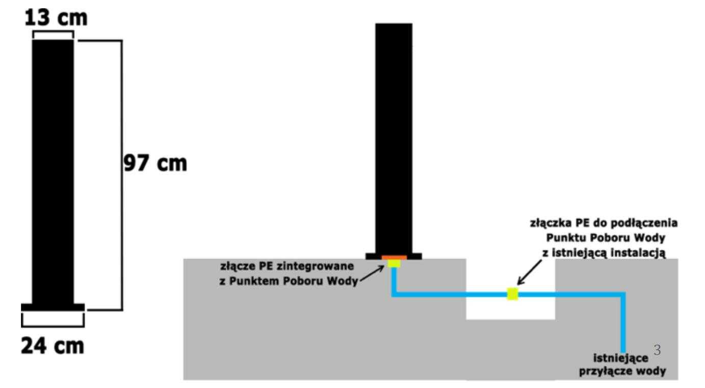 W podstawie wykonane są otwory montażowe co maksymalnie upraszcza sposób mocowania punktu poboru wody do stałego podłoża.
