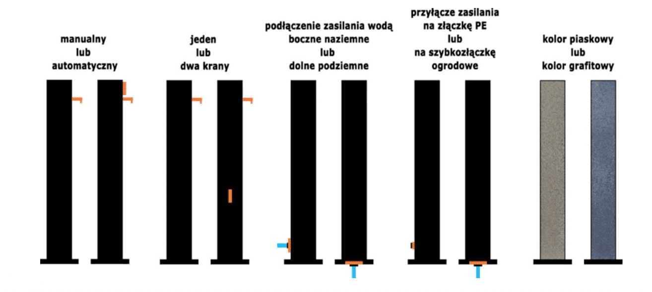 Punkty poboru wody oferujemy w kilku wariantach w kolorze piaskowym lub grafitowym: