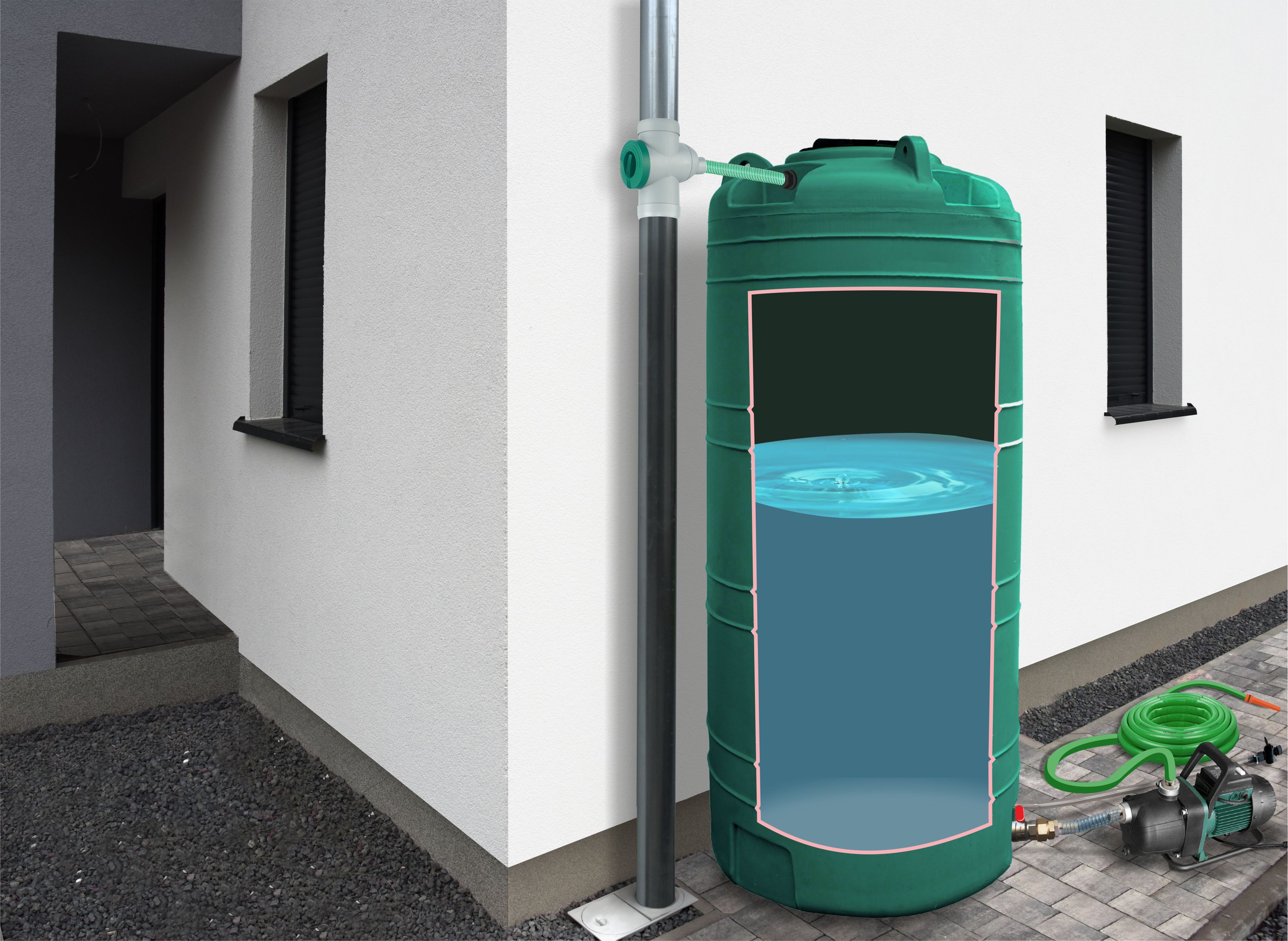 W komplecie jest zestaw do poboru wody z wężem, który montuje się w dolnej części zbiornika, co ułatwia pobór wody deszczowej ze zbiornika.