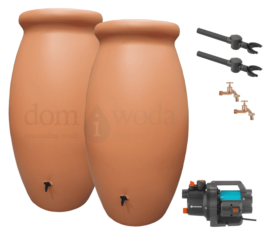 Zestaw retencyjny 2000l. Zbiornik na deszczówkę Amfora 2x 1000l, pompa naziemna, akcesoria, kolor gliniany