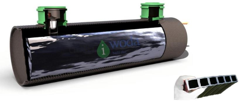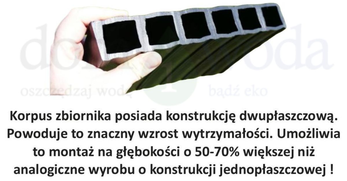 Zbiornik na wodę deszczową wykonany z wysokiej jakości polietylenu (HDPE) o konstrukcji dwupłaszczowej, zapewniającej trwałość i odporność na warunki gruntowe. Może być wykorzystywany również jako zbiornik bezodpływowy na ścieki lub zbiornik przeciwpożarowy.