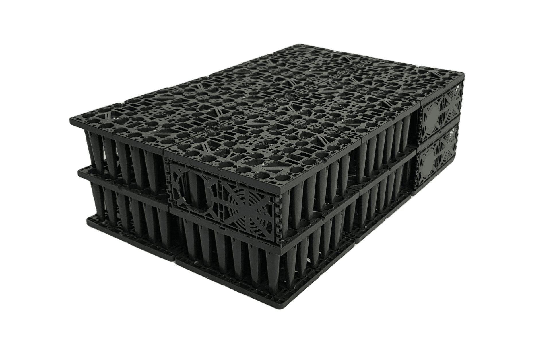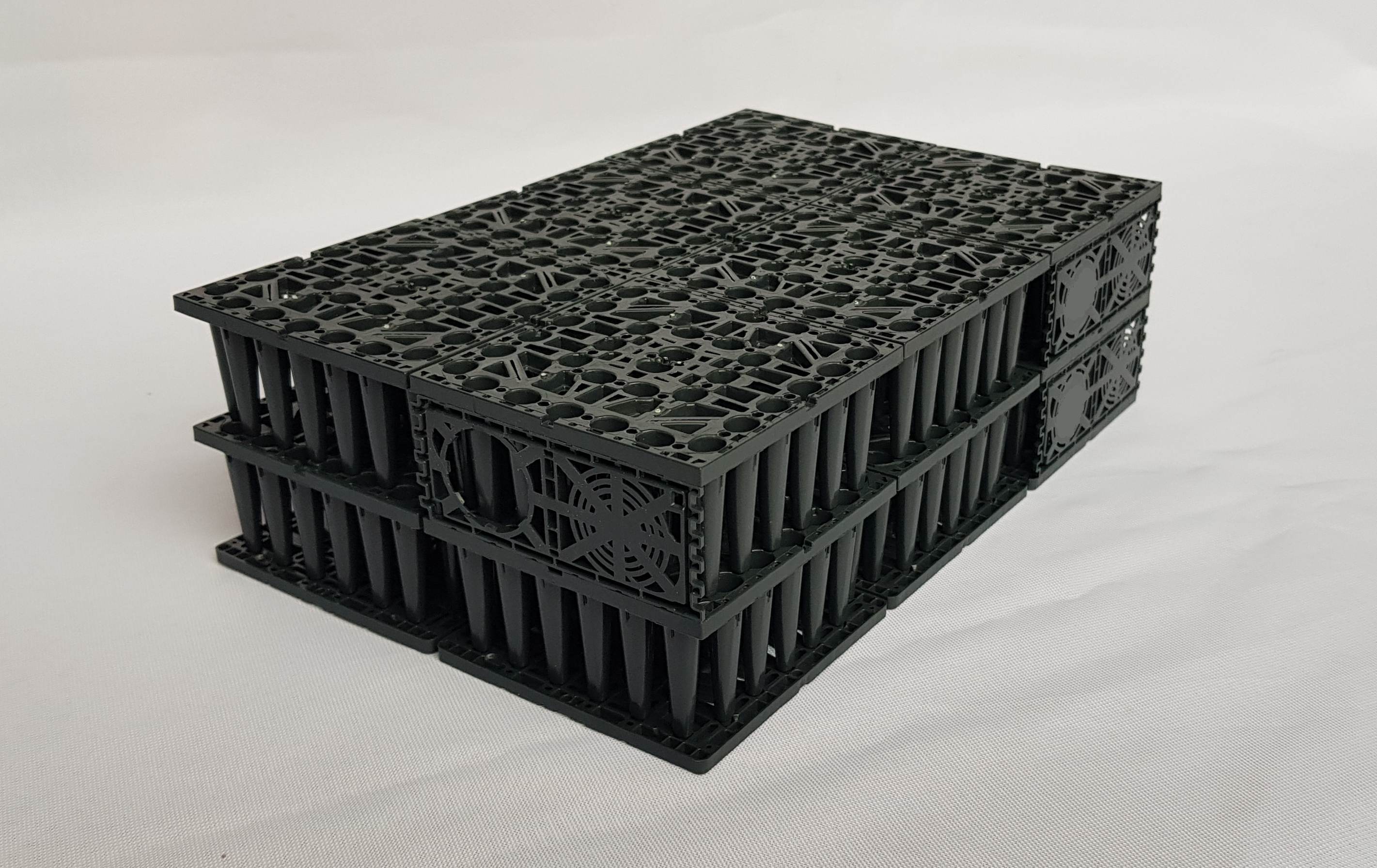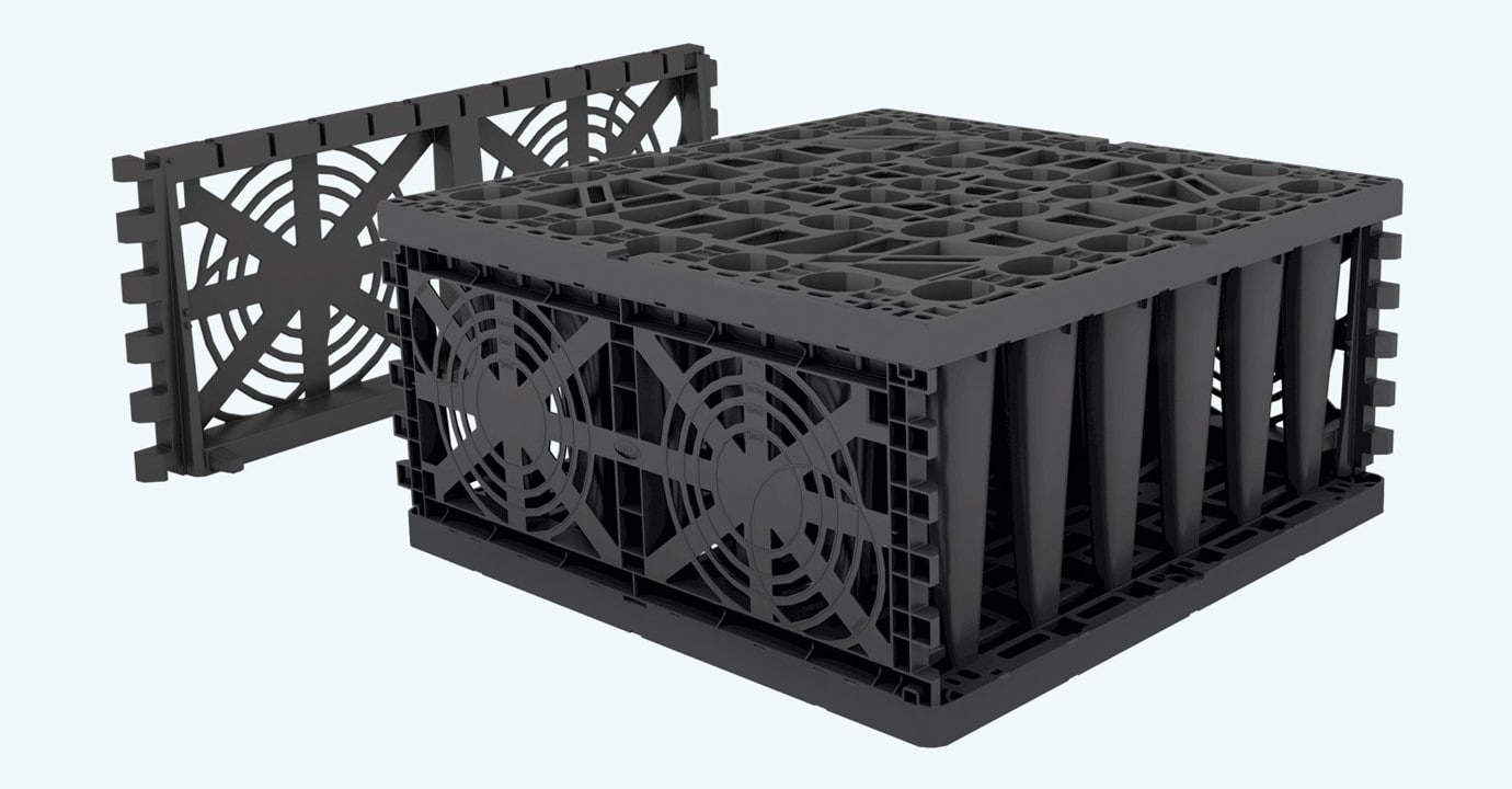 Na dokładnie wypoziomowanym dnie wykopu należy ułożyć i wyrównać warstwę płukanego żwiru o granulacji 8/16. Grubość warstwy podsypki powinna być ok. 15 - 30 cm. Na tak przygotowanym podłożu należy ułożyć pasy wodoprzepuszczalnej geowłókniny TS50. Pasy geowłókniny powinny zachodzić na siebie na 30 – 50 cm. Następnie na geowłókninie układane są moduły EB-m 225. Pod dolną warstwę modułów podkłada się płyty denne (płyty denne układane są tylko pod dolną warstwą). Moduły w każdej warstwie należy połączyć między sobą przy pomocy specjalnych łączników wciskanych od góry w połowie krawędzi bocznej modułów. Nie potrzeba stosować łączników między warstwami, ponieważ moduły posiadają od spodu uformowane bolce, które wchodzą w odpowiednie otwory ściany górnej modułów poniżej. Moduły na czas transportu są wsunięte jeden w drugi. Podczas montażu kolejnej warstwy moduł wyższej warstwy należy obrócić o 90 stopni względem modułu niższej warstwy, żeby oparł się jeden na drugim. Najlepiej moduły układać tak, aby wszystkie w danej warstwie były zorientowane jednakowo. Ścianki boczne montujemy tylko na ścianach zewnętrznych całego układu, na każdej warstwie.