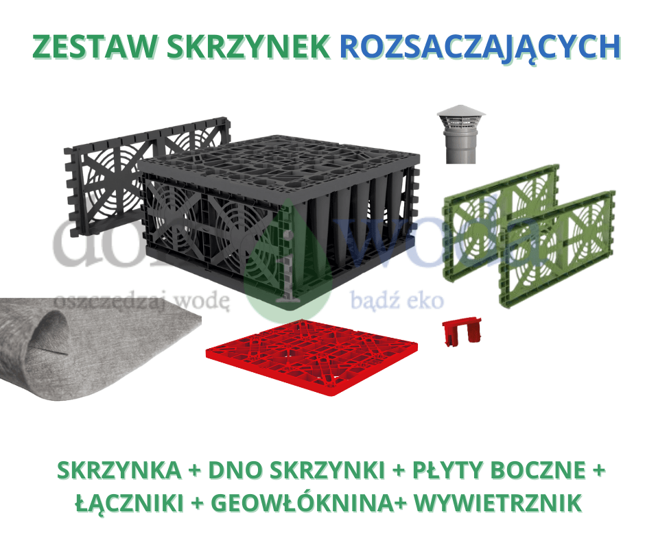Przed zasypaniem cały zespół modułów powinien być całkowicie owinięty geowłókniną, przy czym krawędzie poszczególnych pasów powinny zachodzić na siebie 30 – 50 cm. Zasypkę boczną o grubości min. 30 cm należy wykonać z płukanego żwiru 8/16. Zasypkę boczną od góry przykryć geowłókniną, co zabezpieczy ją przed kolmatacją i zapewni większą szybkość wsiąkania wody z układu.