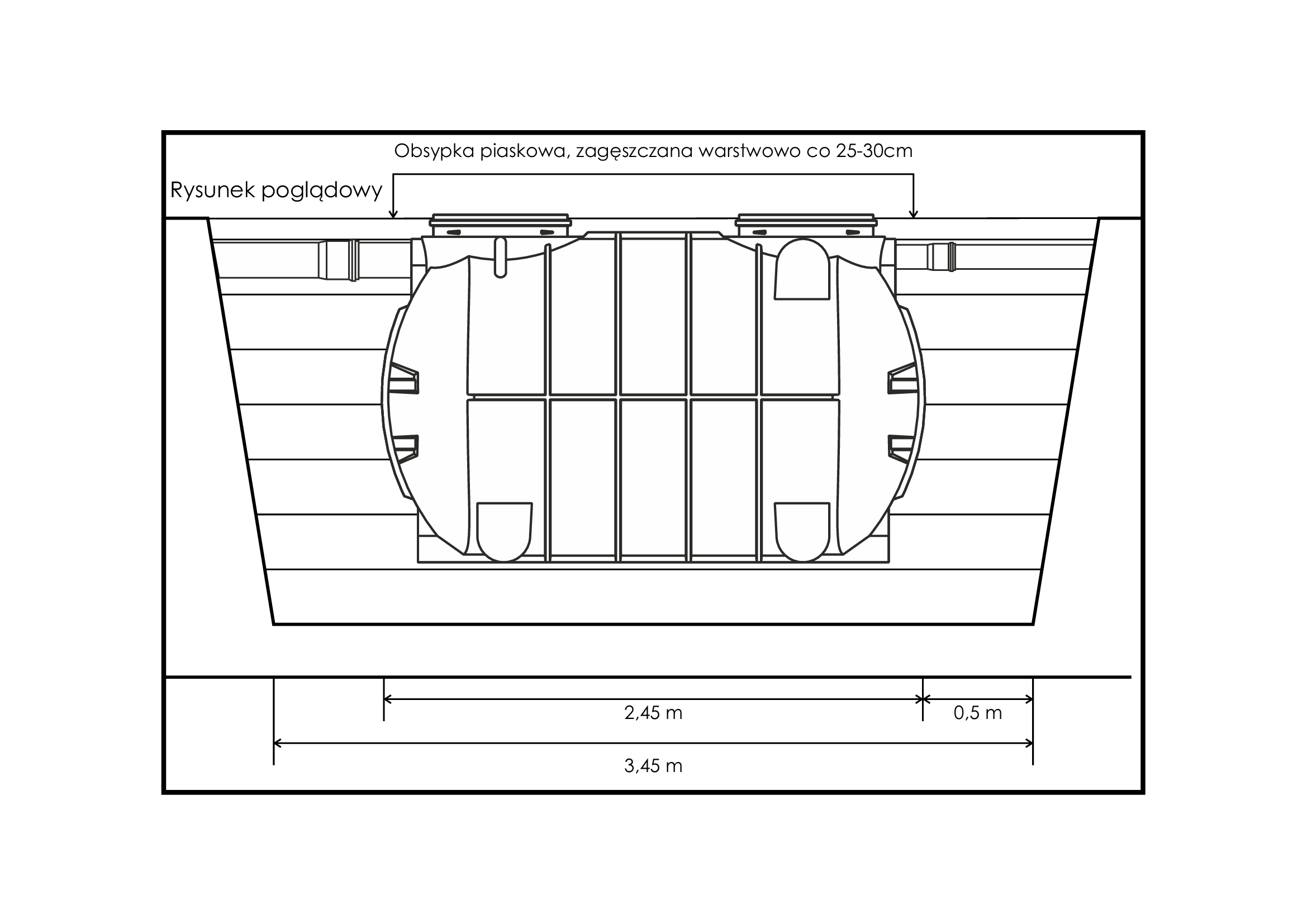 Wstawić zbiornik do wykopu i przyłączyć do wystających króćców rury wlotowej i wylotowej oraz rozpocząć wlewanie wody do zbiornika. Następnie dosypać mieszankę do 1/4 wysokości zbiornika i zastosować co najmniej dwa pasy geowłókniny po bokach wykopu przełożonych przez górną płaszczyznę zbiornika ( tak jak na rysunku ). Dosypywać mieszankę warstwami z zagęszczaniem, każdej z nich. Po przekroczeniu górnej płaszczyzny zbiornika, należy kontynuować obsypywanie warstwami obsypki cementowo-piaskowej do wysokości 10 cm ponad korpus zbiornika.