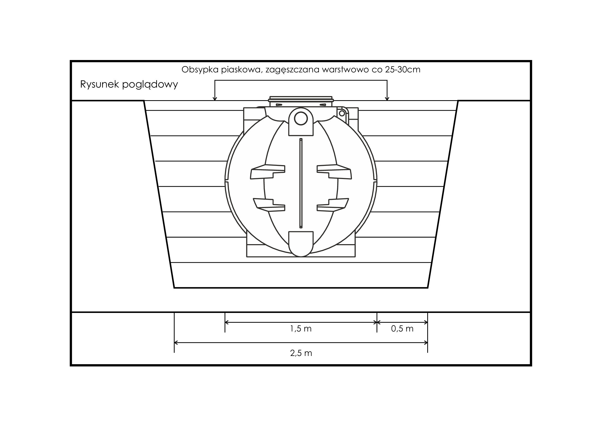 Wykonać wykop tak aby pomiędzy zbiornikiem a ścianami wykopu pozostała wolna 0,5 m. przestrzeń ( w celu obsypania i zagęszczania piaskiem ).